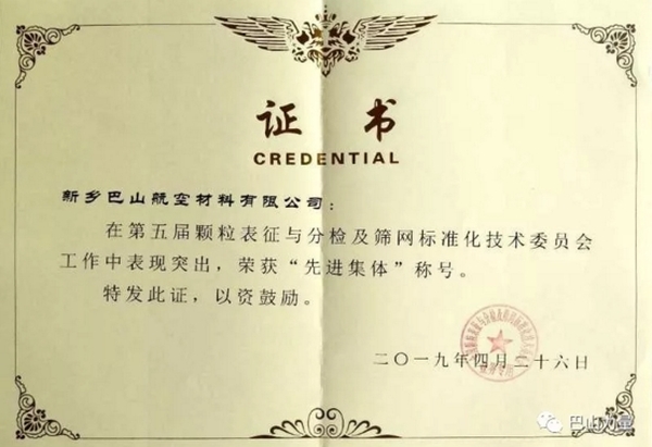 2019年5月,全國顆粒表征與分檢及篩網(wǎng)標準化技術(shù)委員會換屆暨六屆一次會議在江蘇常州召開,會上,巴山公司黨委副書記、總經(jīng)理白潛洋被聘為全國篩標委副主任委員,并代表巴山公司參會。巴山公司作為GB/T6003.1、GB/T6003.2的主要起草單位,GB/T17492的參與起草單位,在全國顆粒表征與分檢及篩網(wǎng)標準化技術(shù)提升中表現(xiàn)突出,具有較強的影響力及引領作用,在此次大會中獲得“**集體”稱號。